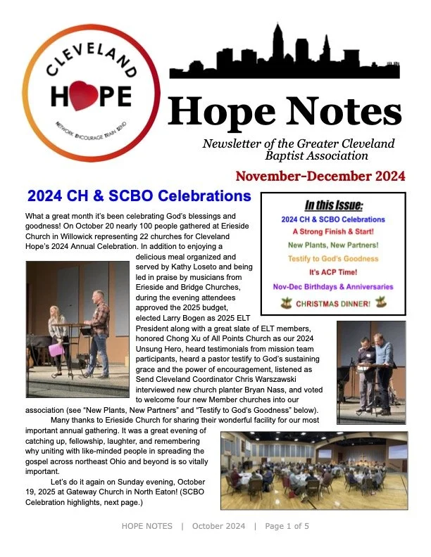 Thanks for stopping by our newsletter page! To close out 2024 we have a combined November-December edition of Hope Notes for you. On behalf of your Cleveland Hope staff team, Kathy Loseto, Todd Bolton and Beth Loseto, we want to wish you a blessed Thanksgiving and a wonderful holiday season as we focus on Jesus our supreme joy and ready ourselves to advance his kingdom together in 2025.